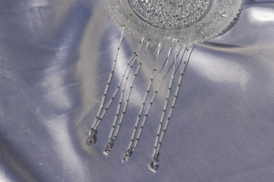 This is our sterling silver collection. These elegant and classic pieces are inspired by the beautiful lights of Dusk- the vibrance of the moon, the soft light of the sun setting and the sparkle of the stars just starting to appear.